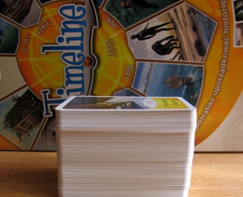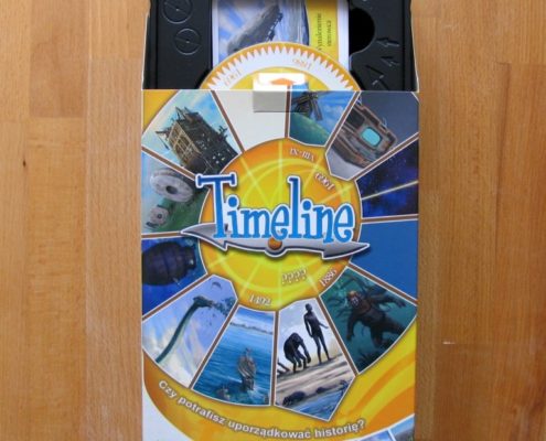 Timeline to seria gier zaprojektowanych przez Frédéric Henry’ego (Asteroyds, The Adventurers), wydana w 2011 r. W jej skład wchodzą 3 części, po 109 kart: Events, Discoveries i Inventions. Wszystkie części zostały wydane w metalowych puszkach. Rok później, po sukcesie serii wydano grę o nazwie Timeline, w tym w języku polskim (Rebel.pl), będącą kombinacją kart z całej serii. Niestety dokonano zmian w wielkości kart, w związku z czym ta wersja nie jest kompatybilna ze wspomnianą serią. Zrezygnowano również z puszek na rzecz niewymiarowego, powietrzonośnego i otwieranego z boku pudełka, w dodatku z cienkiej i nieodpornej tektury, zaopatrzonego w giętką i skrzypiącą, przy każdym wyciąganiu kart, wypraskę. Brr… Na jakość kart nie narzekam. Wszystkie, tj. 220 szt., są wykonane porządnie, z ładnymi grafikami, adekwatnymi do treści. Do tej wersji Timeline dołączona jest również płyta CD z grą komputerową. Najważniejsze jednak jest to, że obie wersje gry, papierowa i komputerowa, są w pełni spolszczone.