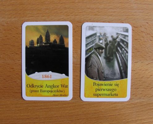 Technicznie nie podoba mi się sposób umieszczania kart w rzędzie. Karty trzeba ciągle rozsuwać, co przy większej liczbie graczy jest już dość pracochłonne i denerwujące. U mnie sprawdziła się metoda układania kart w kolumnie pionowej: dół kolumny to wydarzenia najstarsze, a karty nakładane są na siebie tak, by było widać jej dolną część, czyli nazwę i datę. Mam też trochę zastrzeżeń co do opisu niektórych kart. Przykładowo: „Odkrycie drobnoustrojów” sugeruje badania np. mikroskopem a sytuacja opisana na karcie dotyczy teoretycznego stwierdzenie obecności małych organizmów chorobotwórczych. Takich kart jest jednak bardzo mało.