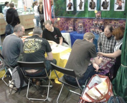 Nasza obecność na Spiel 2012 była więc ponownie działaniem pionierskim, gdyż pierwszy raz jechaliśmy na targi w zasadzie po to by… sprzedawać gotowe gry. W związku z tym duży nacisk położyliśmy na wizualne przygotowanie stoiska, tak by pasowało do tematyki „CLASH’a”. Zabezpieczyliśmy też niemieckojęzyczną obsadę – dzięki naiwności przyjaciół, którzy zgodzili się pojechać z nami na targi i tłumaczyć tam gry po niemiecku, nie wiedząc, w co się dali wrobić… Na szczęście nie odczuliśmy stresu związanego z wyjazdem, ponieważ NajlepszaWPolsceDrukarnia® zadbała o to, byśmy mieli większe problemy (druk gry w ogóle stanął pod znakiem zapytania). Ale nie daliśmy się i w 3 tygodnie udało nam się wydrukować grę gdzie indziej. Podniesieni tym na duchu ruszyliśmy nach westen jedną ze wspaniałych autostrad, która łączy nasze tereny z Niemcami już od lat 30-tych ubiegłego wieku.