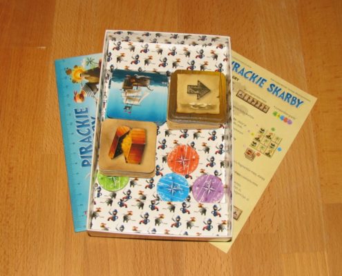 Pierwsze spotkanie dzieci z tą grą dobrze jej nie wróżyło. W grupie 5-6 latków nie wywołała euforii, okazała się za trudna w wersji podstawowej i dzieciaki nawet nie chciały spróbować grać uproszczonej wersji z 3 fragmentami mapy. Taką wersję zaprezentowałam mojej 4latce i przyjęła się. W tym wieku jeszcze trzeba sporo podpowiadać dziecku i nie konkurować z nim, ale pozwolić na swobodne poszukiwania skarbu. Skarby będą odnalezione, a dziecko zadowolone. Po tych doświadczeniach zagrałam jeszcze raz z troszkę starszymi dziećmi i okazało się, że Pirackie skarby to bardzo przyzwoita gra. Trzeba dać jej szansę, bo tak naprawdę reguły dobrze docierają do graczy około 3 partii, mimo, że skomplikowane nie są. To jest właśnie jej jedyny, ale poważny, mankament – nie przyciąga od razu. Młodzieży bardzo się podoba i w tej grupie jest bardzo dużo emocji związanych z wyścigiem o pierwszeństwo w odczytaniu mapy. Mnie przypadła do gustu, bo jest to gra logiczna, z presją czasu, dobrymi rozwiązaniami mechanicznymi odnośnie poruszania się po polu gry, grywalna dzięki losowemu rozstawianiu kafelków, uczy dzieci odczytywania wskazówek i kierunków, jest ładnie wydana i solidna. Po prostu dobra gra w dobrej cenie.