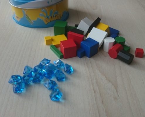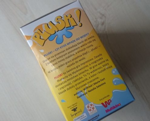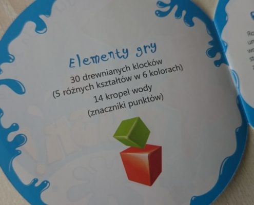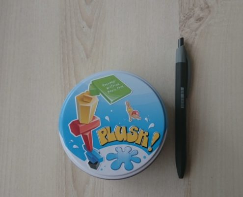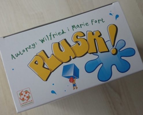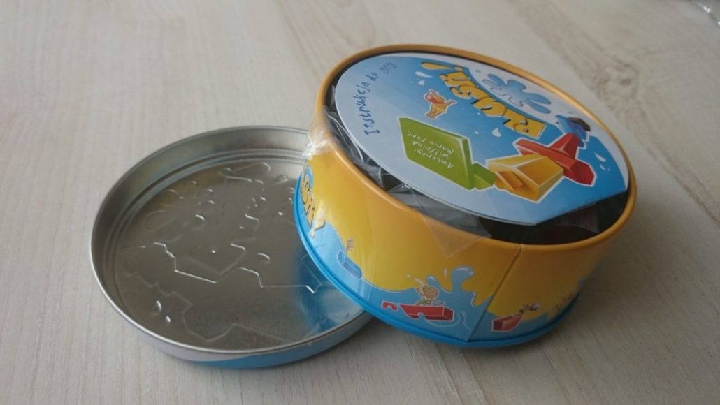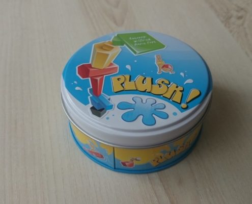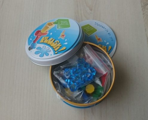 Byłby Plusk! Właściwie, to jest Plusk! Mała gra pod względem wielkości opakowania, wielkości elementów i zasad. Mała, ale sprytna. Wyobraźcie sobie małą, okrągłą puszkę, w dodatku metalową. Wszystko dla wygody i trwałości. W puszce 30 drewnianych klocków, w 5 różnych kształtach i 6 kolorach. Też małych. Do tego 18 kryształków stosowanych jako znaczniki punktacji.