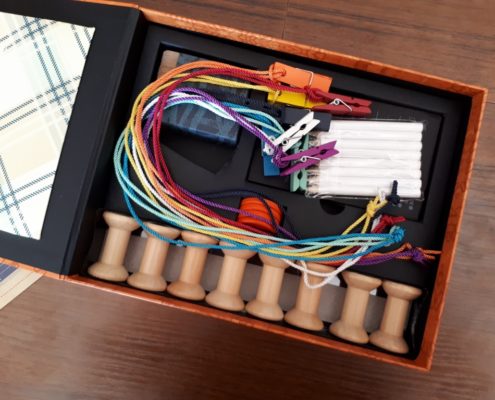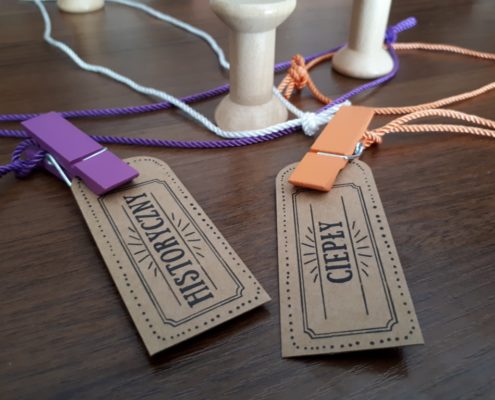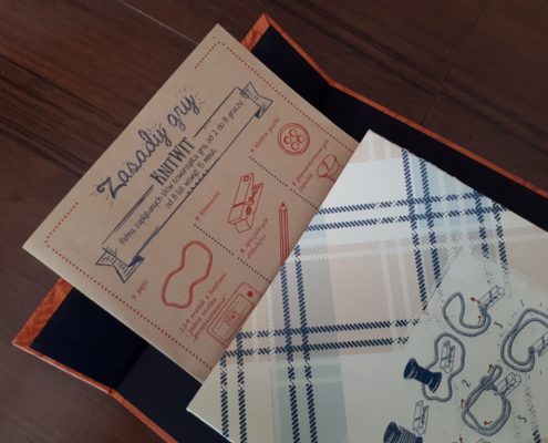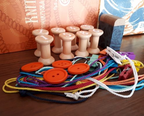 Knit Wit to tematycznie gra o dzierganiu. Podbiła ona serca wszystkich moich graczy, od młodzieży po dorosłych, już od pierwszego spotkania. Samo pudełko i elementy wywołują efekt wow! Jak inaczej można zareagować na świetnie otwierane pudełko (z obwolutą i na magnes), z instrukcją umieszczoną w kieszonce górnej części pudełka i tym wszystkim co znajduje się w środku? Szpulki, włóczki, guziki, metki, klamerki, czarne kartki notesu, białe kredki (krawcowe używają do rysowania po tkaninie białą kredę, cienki kawałek mydła lub właśnie specjalną kredkę). Jakościowo mam tylko zastrzeżenie do wypraski w pudełku – moja uszkodzona jest od nowości, bo wykonano ją z cienkiej tektury.
