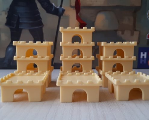 - Chcąc budować zamek trzeba go rozbudowywać przy pomocy dostępnych segmentów wież. Ich liczba zależna jest od liczby graczy. Dołożenie segmentu wieży to 1 PA. Można rozbudowywać zamek u podstawy lub w górę, jednak zgodnie z zasadą, że liczba segmentów w najwyższej wieży w pionie nie może przekroczyć liczby segmentów podstawy. Zamków na planszy nie można też łączyć ze sobą w 1 wielki kompleks. Nie trzeba wykorzystać wszystkich segmentów, część można przenieść do następnej fazy, albo odrzucić.